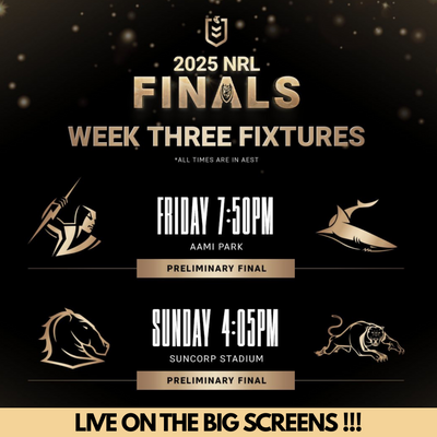 - 2025 NRL FINALS – Catch the lead up to the Grand Final live on our big screens!