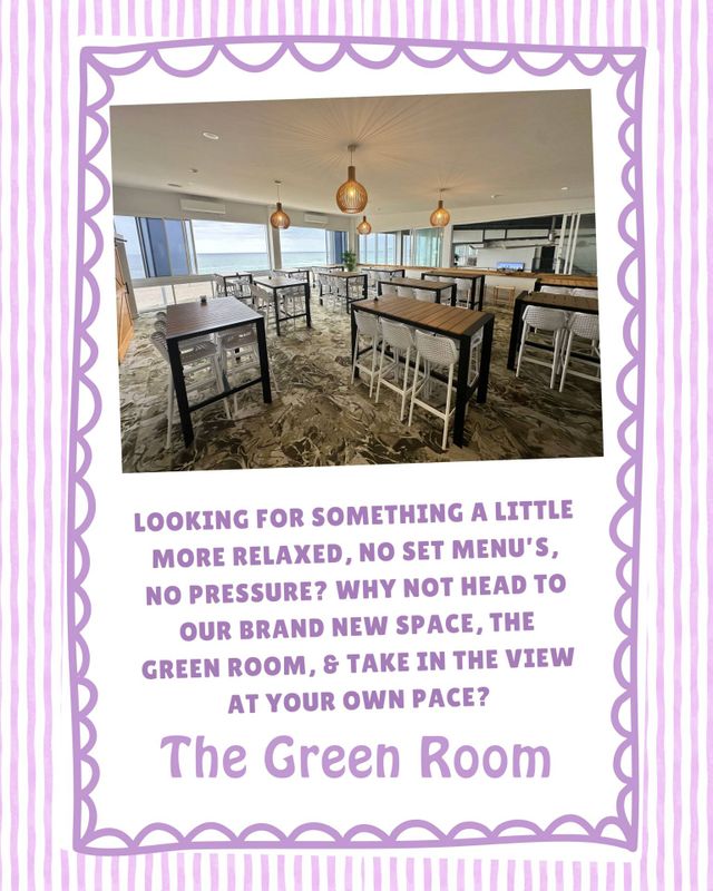 If lunch or dinner isn’t your thing, then take a casual stroll up the stairs to The Green Room where you’ll be able to enjoy the ocean views whilst sitting back with good company and conversation & a refreshing drink in hand!