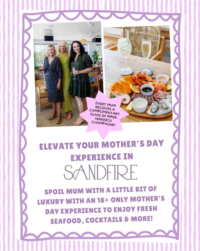 Finally, want to elevate your whole Mother’s Day experience, then why not head upstairs to Sandfire Cocktail Bar and Lounge, so Mum can enjoy a complimentary glass of Piper-Heidsieck Champagne whilst you select from our fresh new Sandfire Menu.